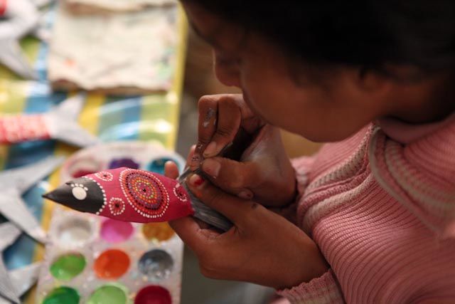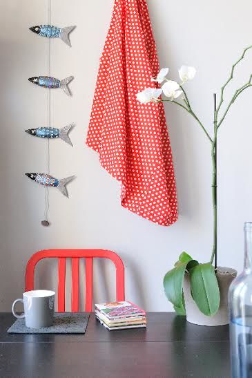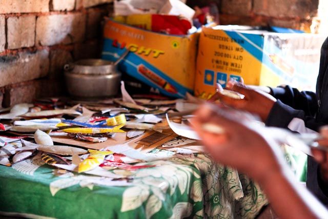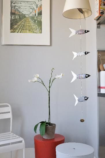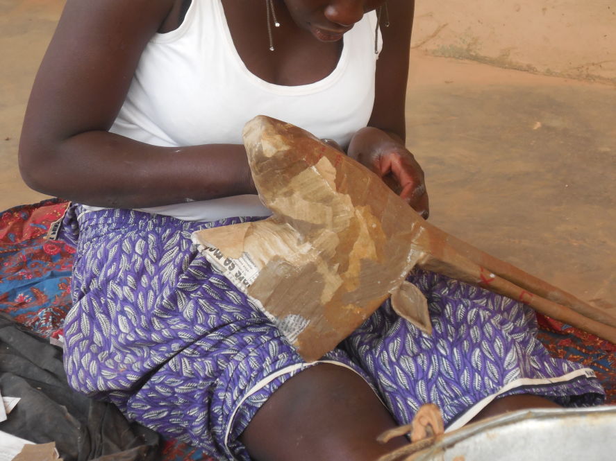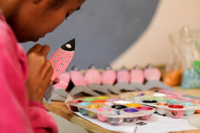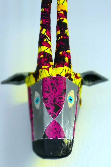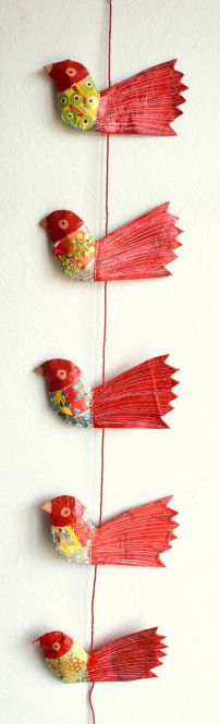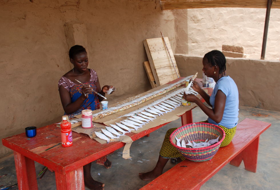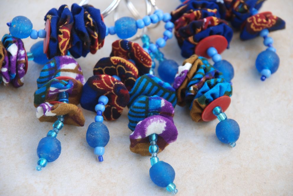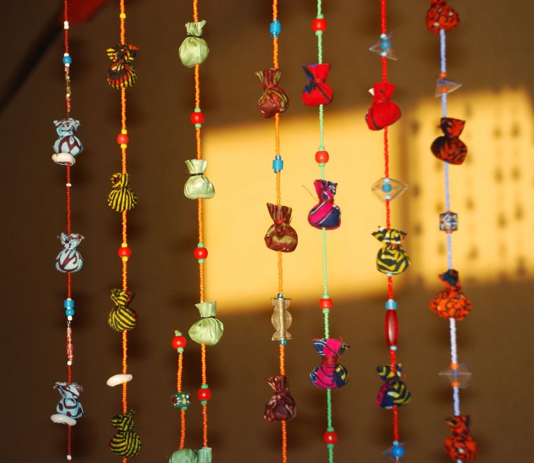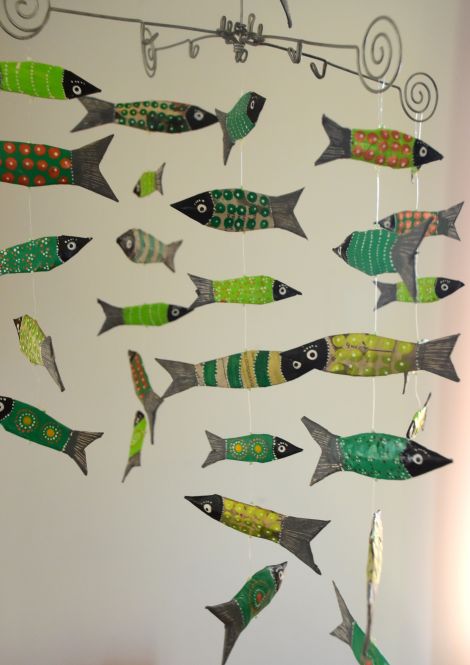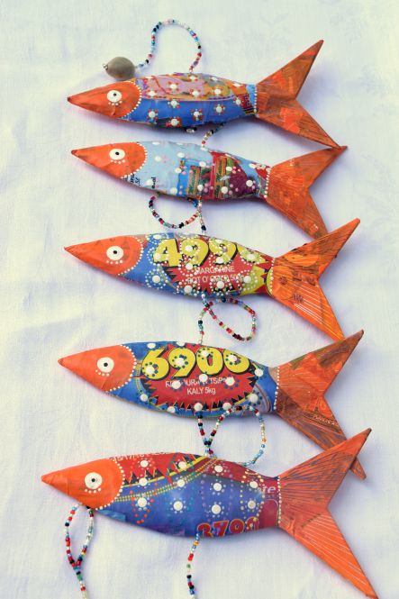 Articles artisanaux entièrement réalisés à la main à base de matériaux recyclés locaux (papier mâché, plastique, tissu): mobiles, objets de décoration, bijoux…