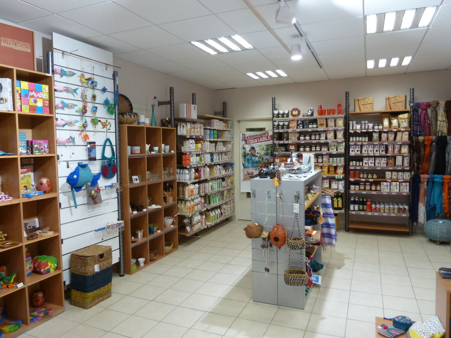 - des produits d’épicerie, textile et d’artisanat, labellisés commerce équitable. Ces produits sont originaires d'Amérique latine, d'Asie, d'Afrique et du Proche Orient. On trouve également des produits issus des producteurs locaux. La majorité des produits alimentaires sont labellisés BIO.